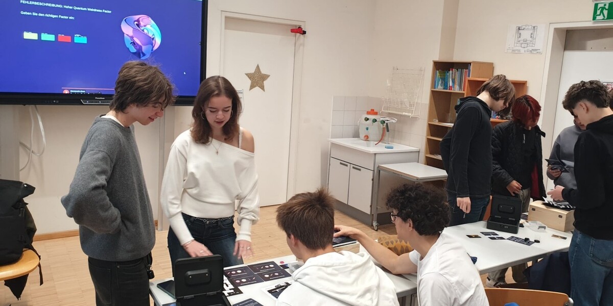 Passend zum World Quantum Year 2025 hatten Schüler:innen zweier Basismodul Physik-Kurse am Mittwoch, 8.10.2025, die Möglichkeit einige Grundprinzipien der Quantenphysik in einem Escape-Game kennen zu lernen. Durch das Programm führte der Quantenphysiker Jan Kumlin, der an der Technischen Universität Wien im Bereich der Quantenoptik forscht.
