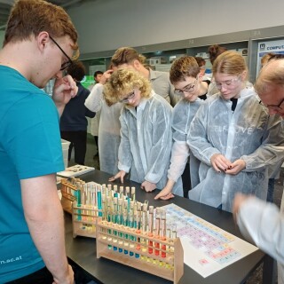 Nach einer wohlverdienten Mittagspause, die mit einem ausgezeichneten Essen versüßt wurde, stand die Besichtigung verschiedener Labore auf dem Programm. Besonders fasziniert zeigten sich die Schüler:innen vom Massenspektrometer zur Untersuchung von Isotopen sowie von den Erklärungen zu Quadrupolen. Ein Überraschungsmoment war das Periodensystem der Elemente aus Traubenzucker, das nicht nur optisch beeindruckte, sondern auch genascht werden durfte. Abgerundet wurde dieser Teil durch Zuckerwasser aus Reagenzgläsern.