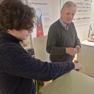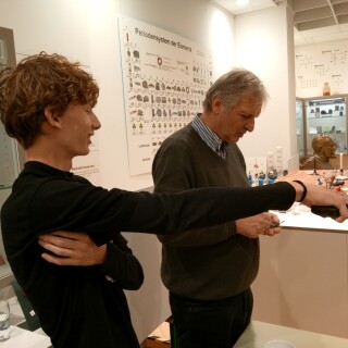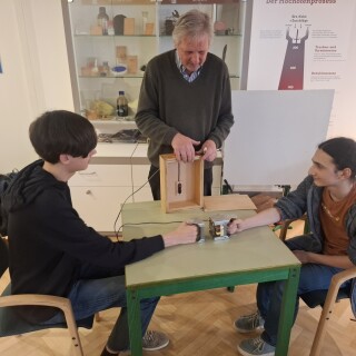 Spielerisch und mithilfe zahlreicher selbst gebauten Anschauungsobjekte erläuterte der Vortragende die zukunftsträchtigen Erfindungen und wichtige Lebensstationen des Wissenschaftlers auf anschauliche Weise. Die Schüler:innen erfuhren, dass man brennbaren Baumschwamm, in Urin getränkt, zur Feuererzeugung nutzen kann und wie man Feuer mit einem Stock macht. Oder auch nicht. Beim Heben eines Magneten von einer Metallplatte kamen die meisten Schüler:innen an ihre persönlichen Grenzen, ein paar wenige schafften es jedoch, wie König Arthur das Schwert (oder in dem Fall den Stein) zu heben.
