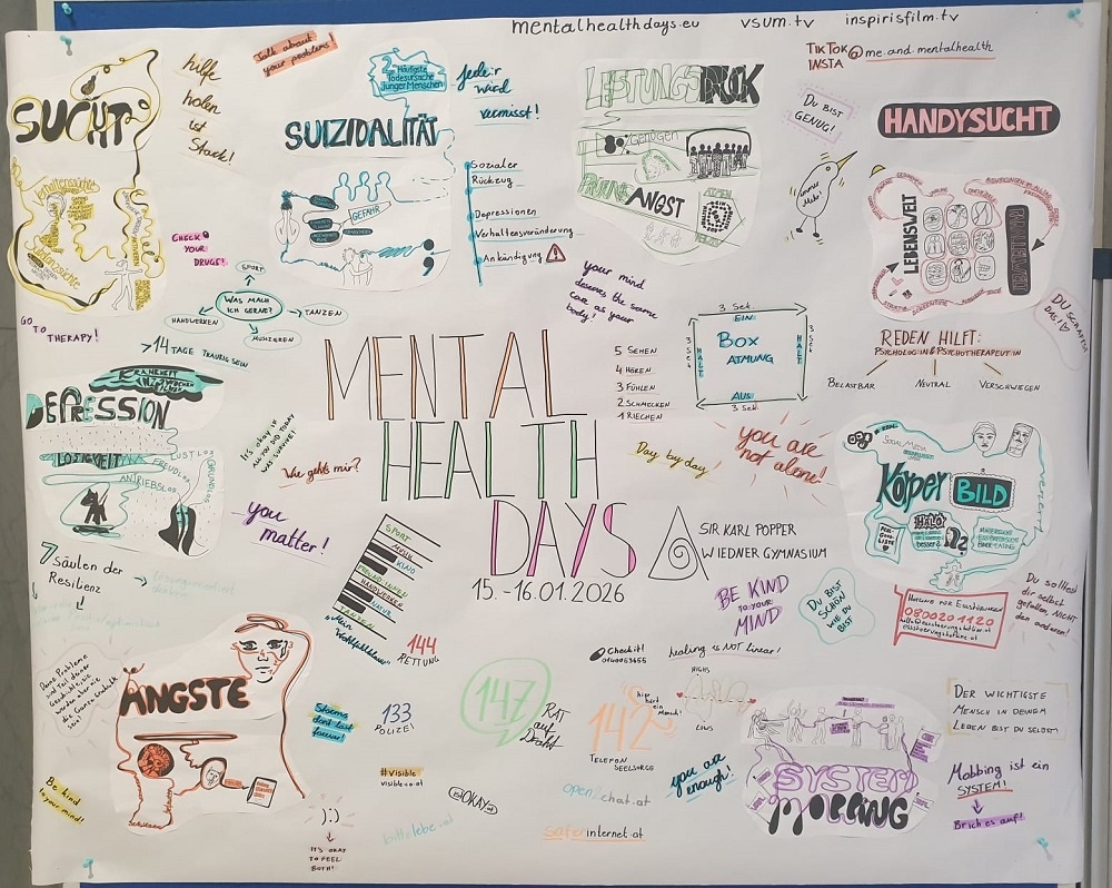 Im Rahmen der Mental Health Days setzten sich die Schüler:innen des Wiedner Gymnasiums/ Sir Karl Popper Schule mit Themen der psychischen Gesundheit auseinander. Ziel der Projekttage der Vereins »vsum« (Verein zur Förderung eines selbstbestimmten Umgangs mit Medien) war es, das Bewusstsein für das eigene Wohlbefinden zu stärken, psychische Belastungen zu enttabuisieren und über konkrete Strategien sowie Anlaufstellen zu informieren.