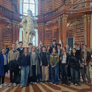 Im Anschluss besuchte die Klasse den Prunksaal, einen der beeindruckendsten Bibliotheksräume Europas. Zwischen barocken Regalen, historischen Globen und kunstvollen Fresken entstand ein lebendiger Eindruck davon, wie eng Geschichte, Architektur und Literatur miteinander verwoben sind.